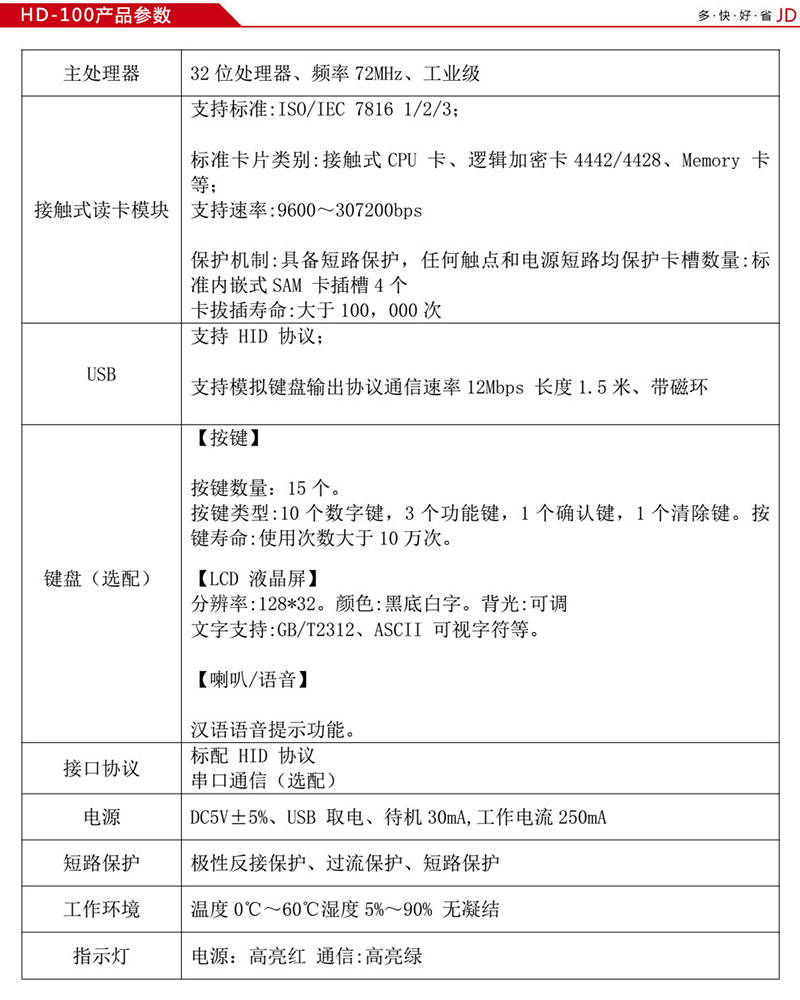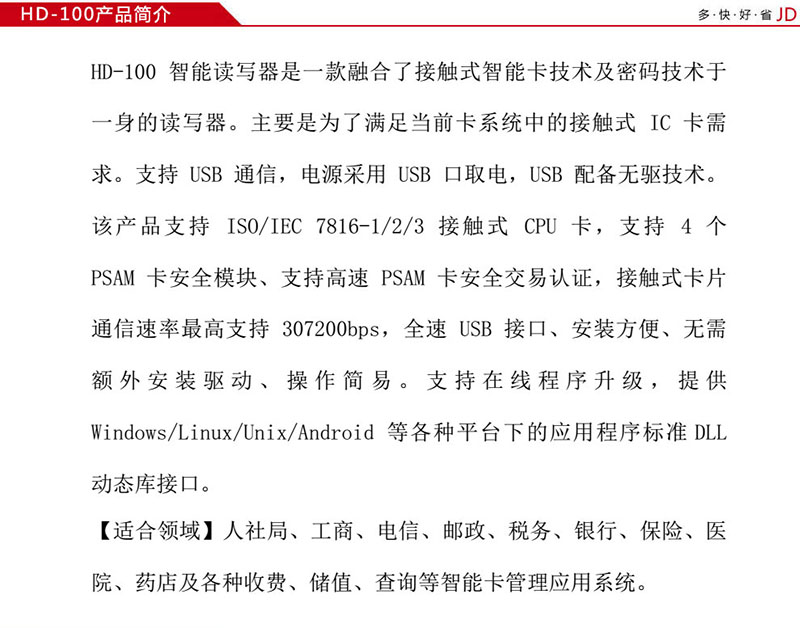 华大HD-100医保卡智能卡读写器是一款融合了接触式智能卡技术及密码技术于一身的读写器。主要是为了满足当前卡系统中的接触式 IC 卡需求。支持 USB 通信,电源采用 USB 口取电,USB 配备无驱技术。该产品支持 ISO/IEC 7816-1/2/3 接触式 CPU 卡,支持 4 个 PSAM 卡安全模块、支持高速 PSAM 卡安全交易认证,接触式卡片通信速率最高支持 307200bps,全速 USB 接口、安装方便、无需额外安装驱动、操作简易。支持在线程序升级,提供 Windows/Linux/Unix/Android 等各种平台下的应用程序标准DLL 动态库接口。
